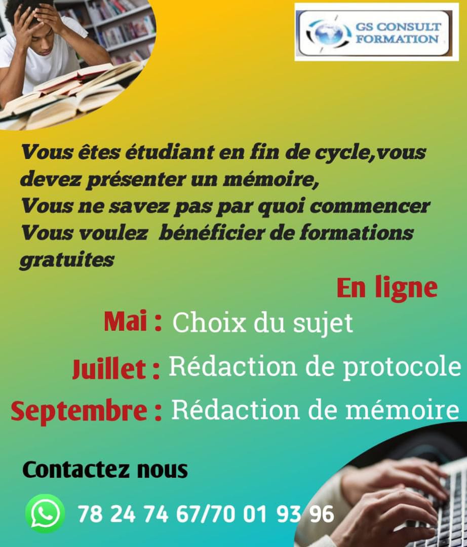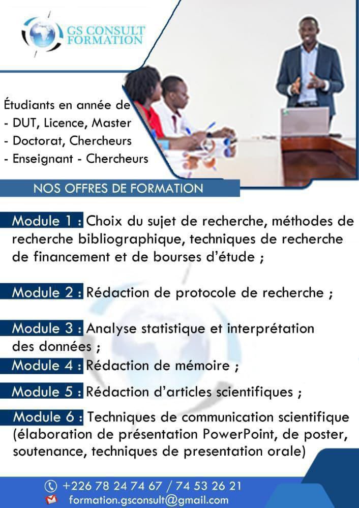 GS Consult Formation est un cabinet de formation en rédaction scientifique, fait des prestations en ligne, en présentielle, et en coaching individuel. Le cabinet a été crée le 9 Septembre 2018 dans une optique d'assistance sociale aux étudiants en fin de cycle.